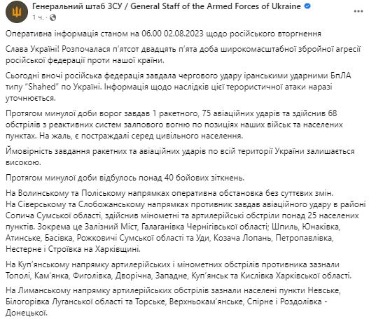 Утром 2 августа Генштаб ВСУ обнародовал сводку о ситуации на фронте.
