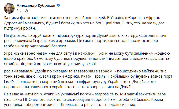 "Россияне нанесли удары по складам и элеваторам с зерном - повреждено почти 40 тысяч тонн зерна, которое ожидали страны Африки, Китай, Израиль. Наибольшие разрушения получил порт Измаил. Поврежден морской вокзал и инфраструктура Украинского Дунайского пароходства, ключевого украинского грузоперевозчика на Дунае", - написал Кубраков.