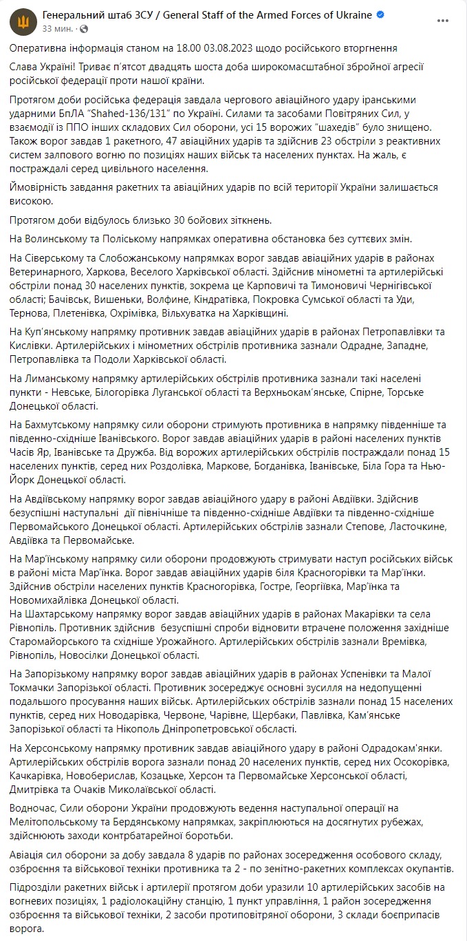 Генштаб ВСУ опубликовал оперативную информацию о российском вторжении по состоянию на 18:00 3 августа.