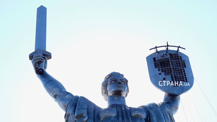 "Родина-Мать" перед установкой украинского герба. Фото: "Страна"