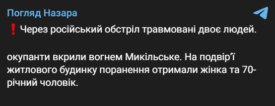 "Из-за российских обстрелов травмированы два человека. Оккупанты покрыли огнем Никольское. Во дворе жилого дома ранения получили женщина и 70-летний мужчина", - пишет Назаров.