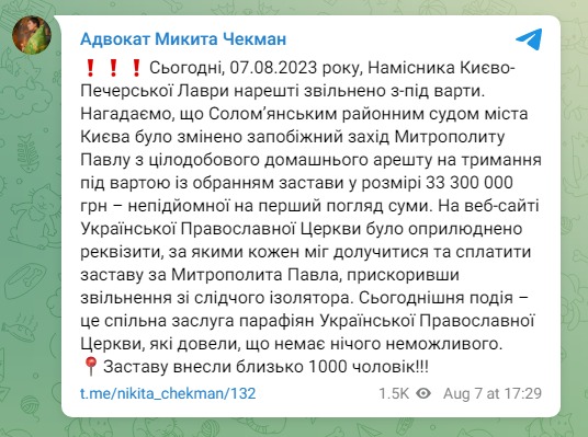 "На сайте Украинской православной церкви были обнародованы реквизиты, по которым каждый мог присоединиться и оплатить залог за митрополита Павла, ускорив освобождение из следственного изолятора. Сегодняшнее событие – это общая заслуга прихожан Украинской православной церкви, доказавших, что нет ничего невозможного. Залог внесли около 1000 человек!" - сказано в посте.