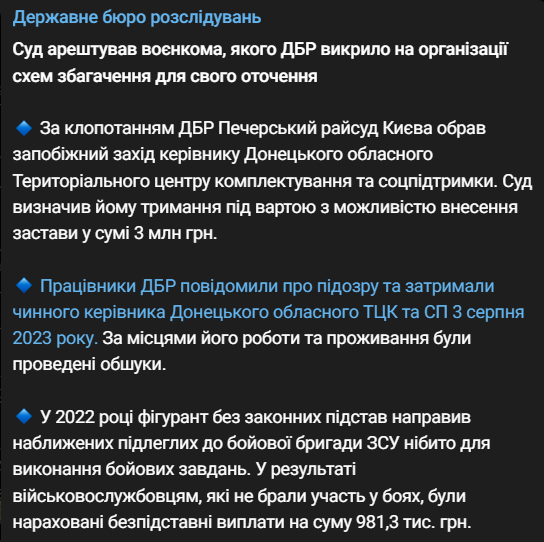 Напомним, сотрудники ГБР сообщили о подозрении и задержали действующего руководителя Донецкого областного ТЦК и СП 3 августа 2023 года. По местам его работы и проживания были проведены обыски.