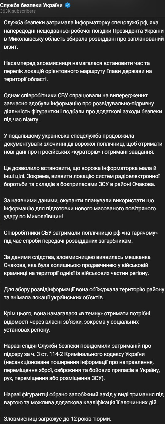 СБУ сообщает, что заранее получила информацию о подготовке покушения и приняла дополнительные меры безопасности во время визита, а сама продолжила документировать действия женщины и задержала ее "при попытке передачи разведданных в РФ".