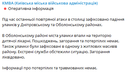 Обломки сбитых ракет обнаружены в Днепровском районе и на жилом массиве Оболонского района. Было возгорание, его уже потушили.