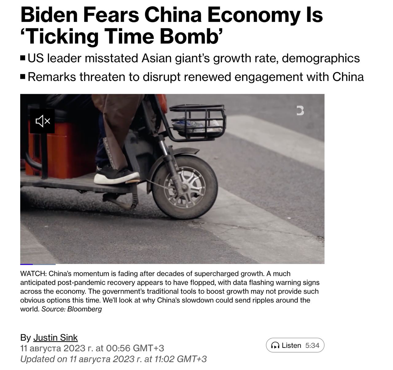 "Китай рос на 8% в год, чтобы поддерживать рост, который сейчас приближается к 2% в год. Это ситуация, когда количество людей пенсионного возраста превышает количество людей трудоспособного возраста. Поэтому у них возникли некоторые проблемы. Это нехорошо, потому что, когда у плохих людей возникают проблемы, они делают плохие вещи", - заявил Байден.