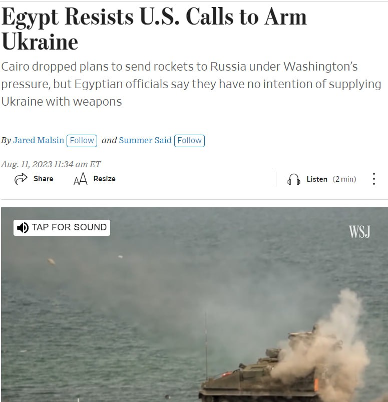 По данным собеседников газеты, еще в марте текущего года американские чиновники, включая министра обороны США Ллойда Остина, обратились к египетскому президенту Абдель Фаттаху ас-Сиси с просьбой отправить Киеву оружие, чтобы помочь украинским властям преодолеть нехватку боеприпасов. Речь шла об артиллерийских снарядах, противотанковых ракетах, системах ПВО и стрелковом оружии.