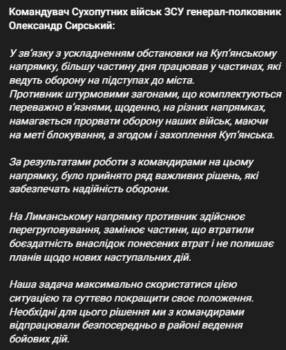 "Противник штурмовыми отрядами, комплектующимися преимущественно заключенными, ежедневно, на разных направлениях, пытается прорвать оборону наших войск, преследуя цель блокирования, а впоследствии и захвата Купянска", - сказал Сырский.