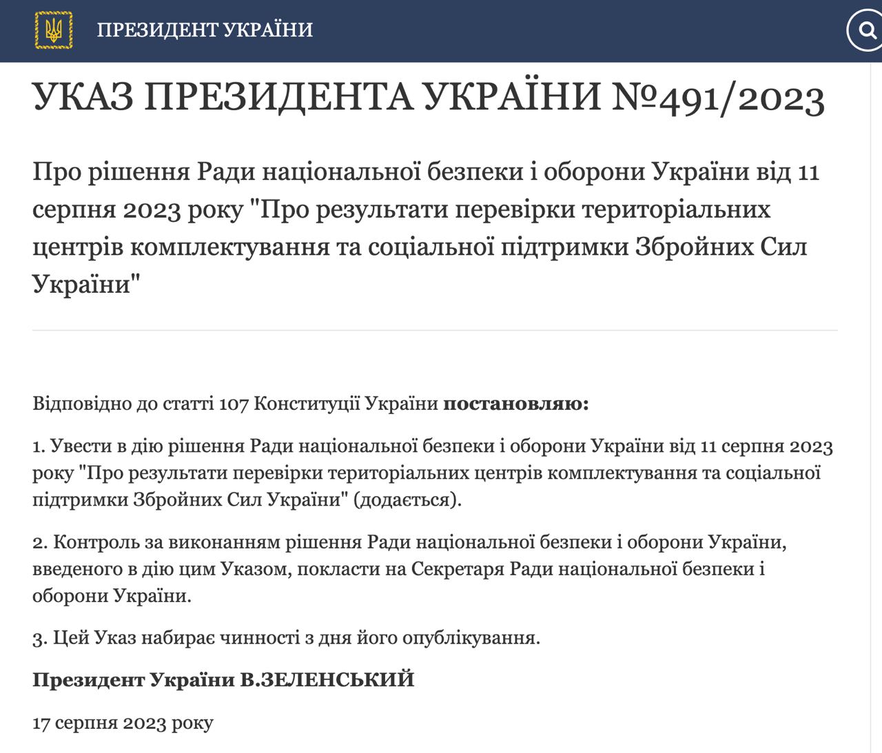 1. Ввести решение Совета национальной безопасности и обороны Украины от 11 августа 2023 года "О результатах проверки территориальных центров комплектования и социальной поддержки Вооруженных сил Украины".