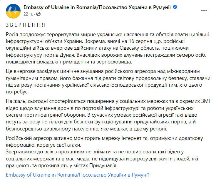Украинское посольство в Румынии обратилось к жителям приграничных румынских территорий с просьбой не снимать работу ПВО и моменты российских прилетов по портам Украины.