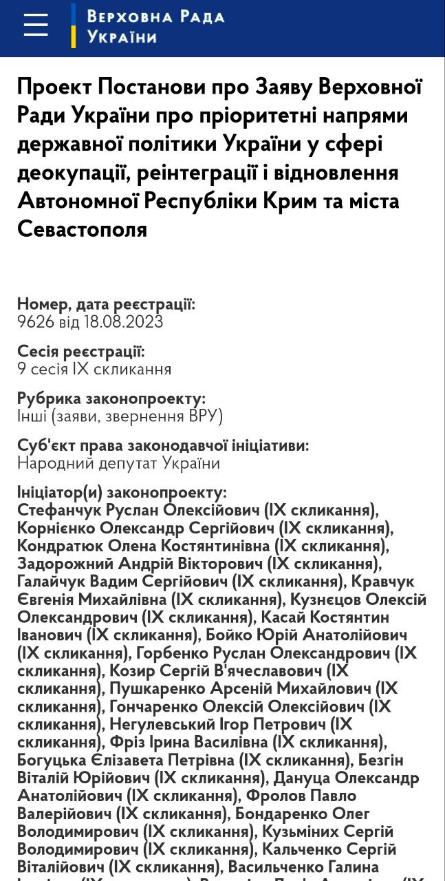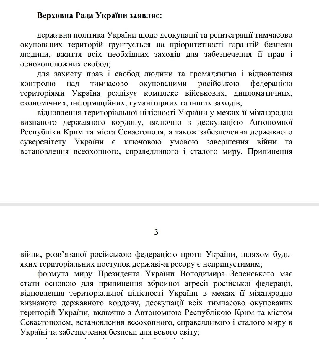 Постановление предлагает принять заявление Рады о госполитике по деоккупации Крыма. Там в основном идёт речь о том, что Украина должна делать на полуострове после его освобождения.