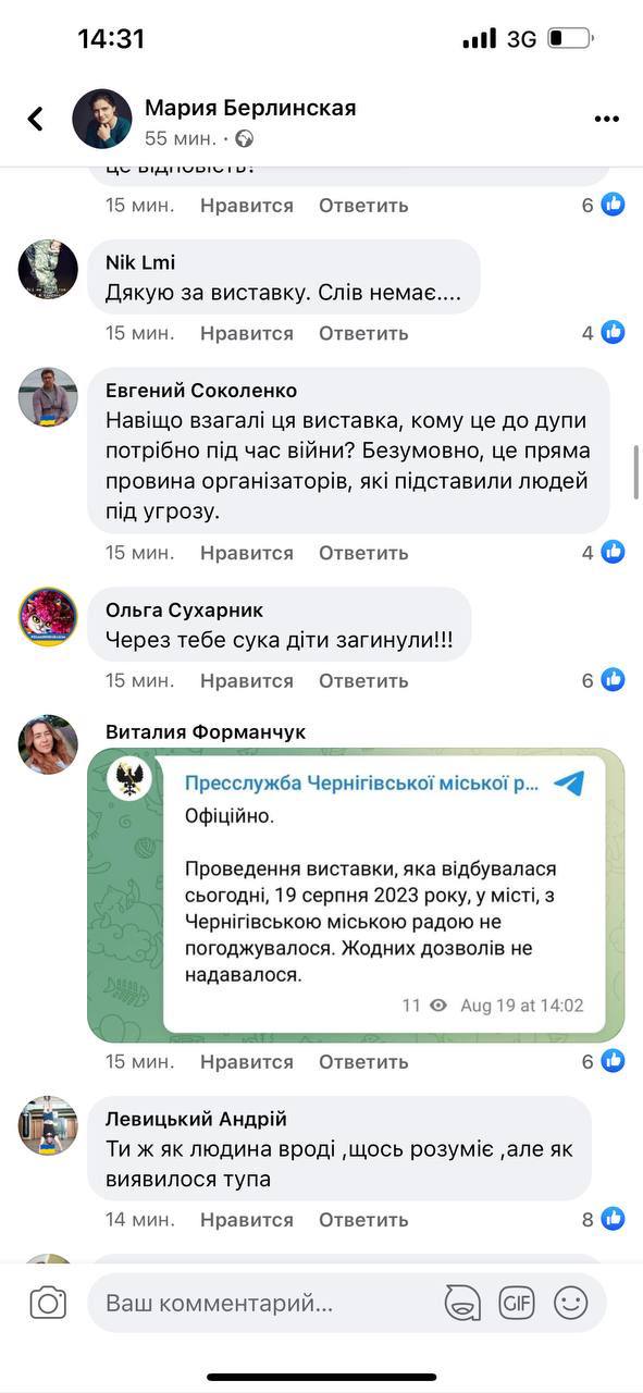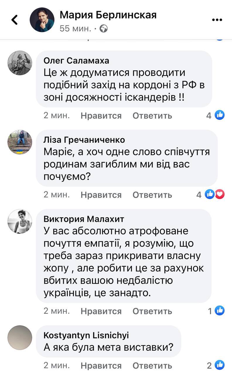 Также много негативных комментариев и под постом организатора выставки Марии Берлинской, где она отвергает обвинения в свой адрес.