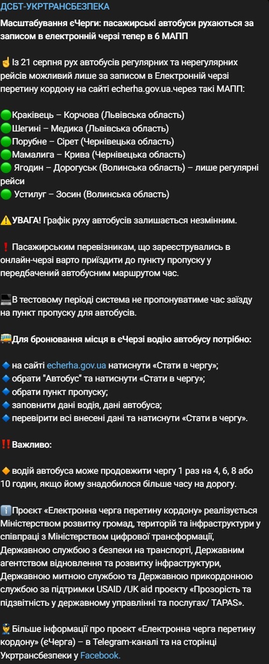 Проект "еЧерга" масштабирован на пассажирские автобусы, которые теперь будут проходить шесть пунктов пропуска по записи в электронной очереди.