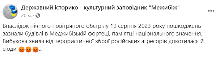 В Хмельницкой области в результате обстрелов 19 августа повреждена Меджибожская крепость XIV-XVI века. Взрывной волной повреждены окна, двери и кровля Рыцарской башни.