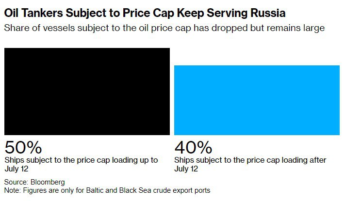 Около 40% судов, вывозящих нефть из российских портов Балтийского и Черного морей, принадлежат западным компаниям, которые должны соблюдать потолок цен в 60 долларов за баррель.