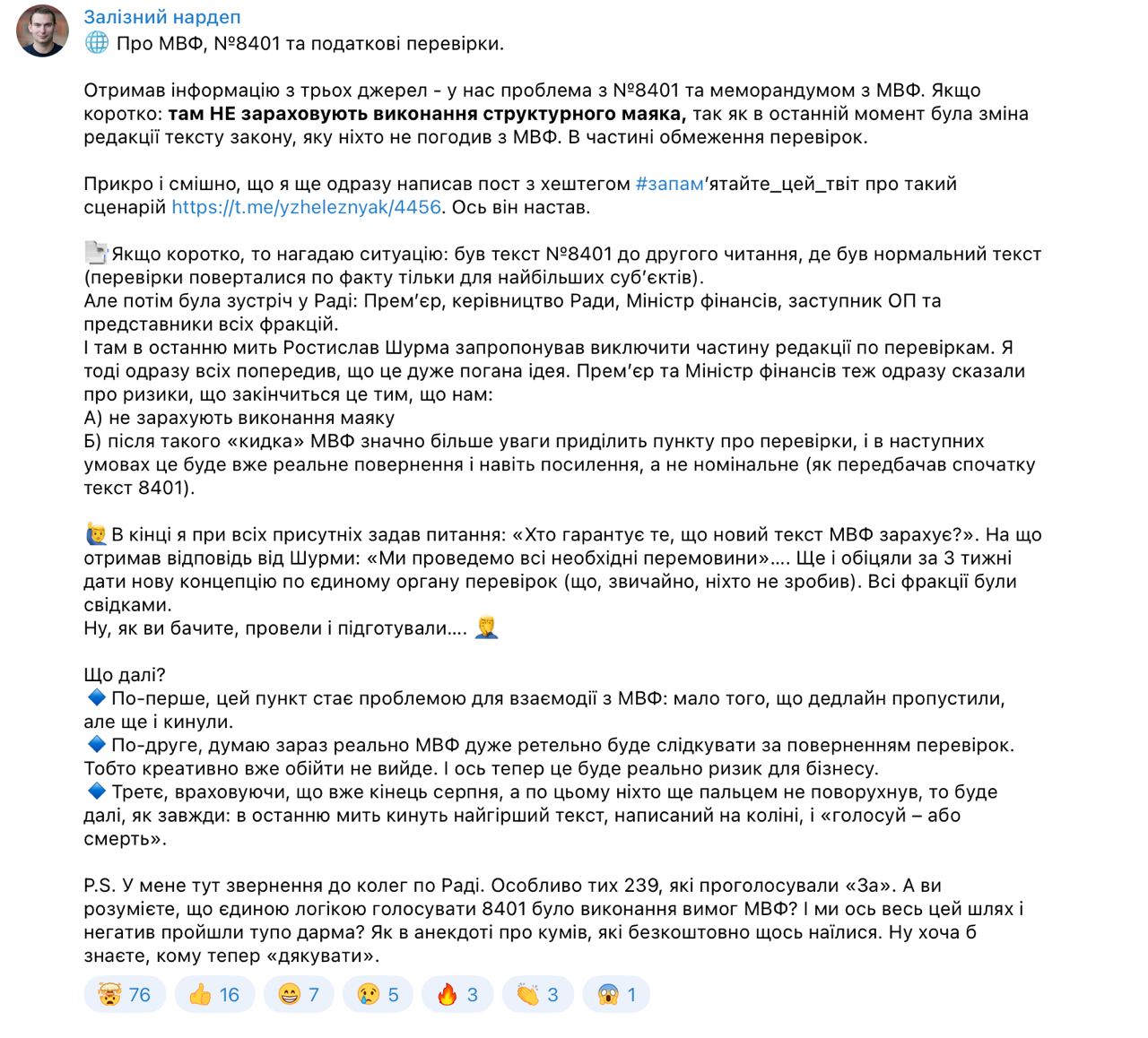 Напомним, что норма о возвращении налоговых проверок содержалась изначально в законопроекте 8401, принятие которого было требованием МВФ. Помимо прочего он предусматривал возврат довоенных налогов (в частности, отмену 2% налога для бизнеса).