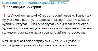 07.55 Ночью РФ обстреляла Волчанск в Харьковской области. Повреждены четыре частных дома. В одном из них их-под завалов достали 56-летнюю женщину. В госпитализации она не нуждалась.