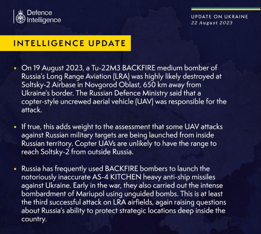 Так, 19 августа 2023 г. средний бомбардировщик Ту-22М3 дальней авиации РФ вероятно был уничтожен на авиабазе "Сольцы" в Новгородской области, в 650 км от границы с Украиной.