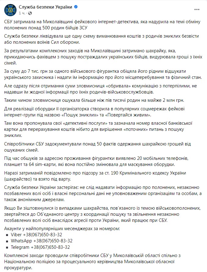 В Николаевской области СБУ задержала женщину, подозреваемую в обмане членов семей пленных военных. Она более 500 семей.