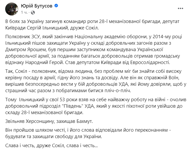 По данным Бутусова, Сокол принимал участие в операциях по освобождению правобережья Херсонской области и в боях за Бахмут.