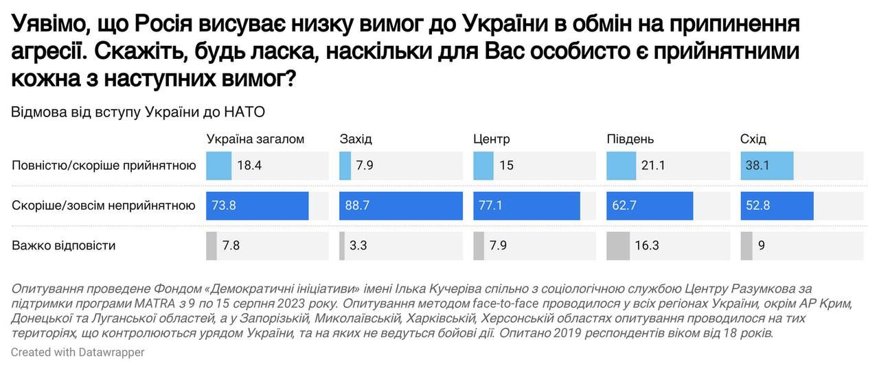 В то же время большинство опрошенных отрицательно отнеслись к предложенным вариантам уступок России ради прекращения войны: отказ от вступления в НАТО, согласие с аннексией территорий, сокращение численности ВСУ, предоставление русскому языку статуса государственного, отказ от политики декоммунизации.