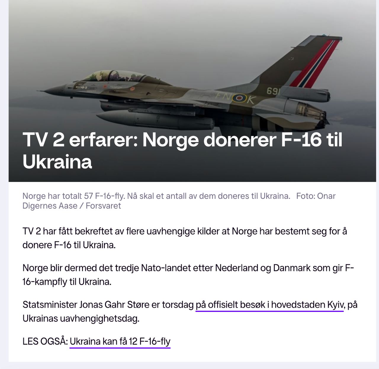 15.50 Норвегия тоже передаст Украине истребители F-16 - вслед за Данией и Нидерландами. Об этом сообщает местный телеканал TV2 со ссылкой на источники.