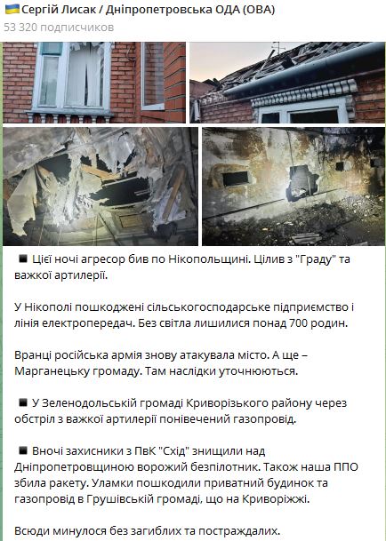 Утром силы РФ снова атаковала город. А также Марганецкую громаду. Там последствия уточняются.