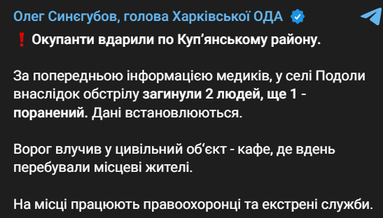 В селе Подолы Купянского района Харьковской области два человека погибли в результате российского удара по кафе, еще один ранен.