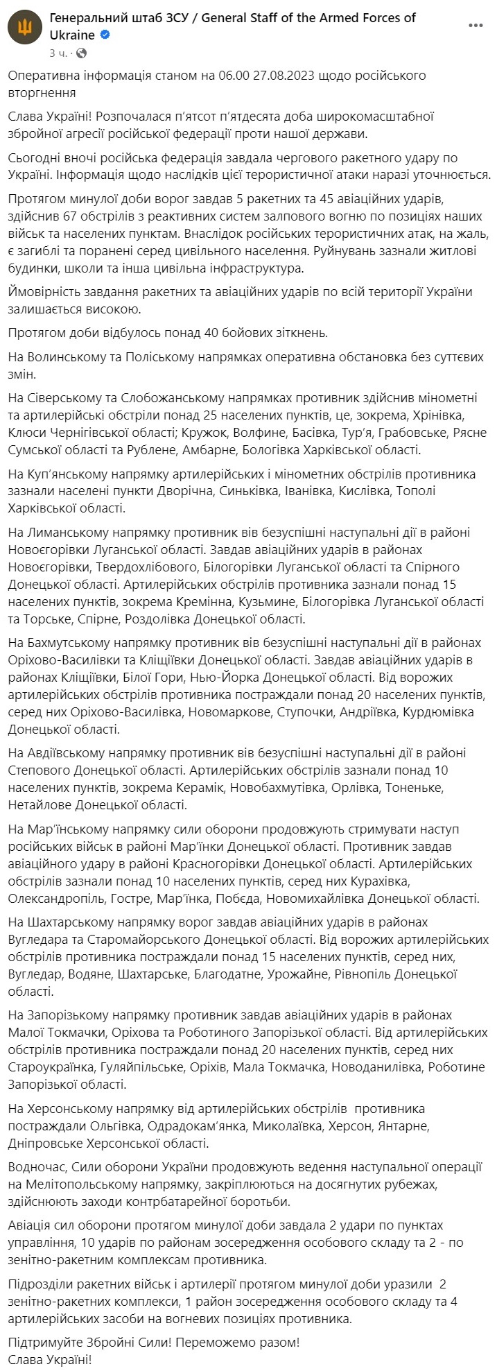За прошедшие сутки Россия нанесла 5 ракетных и 45 авиационных ударов, совершила 67 обстрелов из реактивных систем залпового огня по позициям наших войск и населенным пунктам. В течение суток произошло более 40 боевых столкновений.