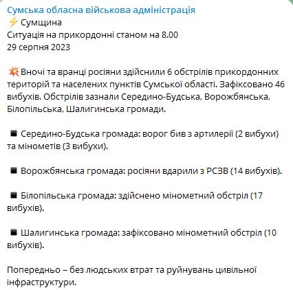 08.22 Ночью и утром силы РФ обстреляли приграничные районы Сумской области из минометов и артиллерии.