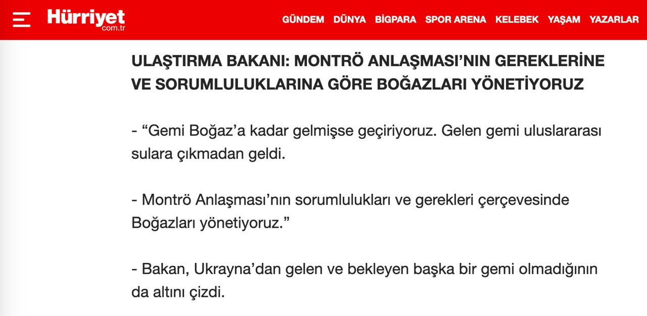 Однако добавил, что если какое-то судно достигнет Босфора, как это сделал контейнеровоз Joseph Schulte под флагом Гонконга, то его пропустят.
