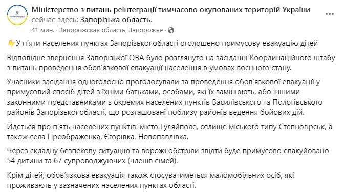 В пяти населенных пунктах Запорожской области объявлена принудительная эвакуация детей.