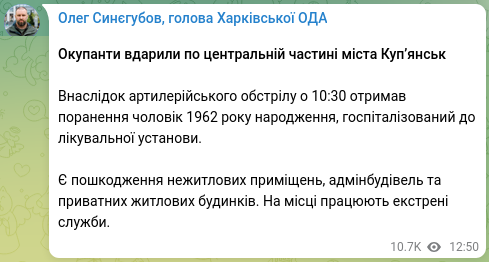 Утром 31 августа силы РФ обстреляли центр Купянска из артиллерии.