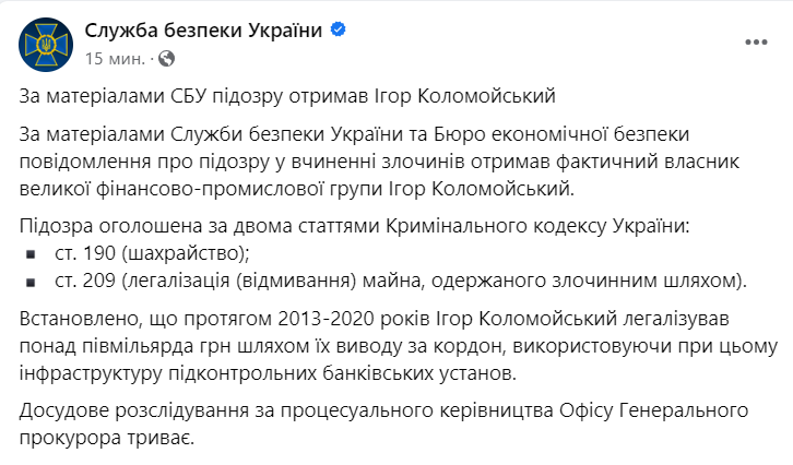 По материалам Службы безопасности Украины и Бюро экономической безопасности, сообщение о подозрении в совершении преступлений получил фактический владелец крупной финансово-промышленной группы Игорь Коломойский.