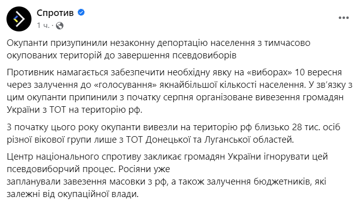 Россия приостановила незаконную депортацию населения с временно оккупированных территорий для обеспечения явки на псевдовыборах.