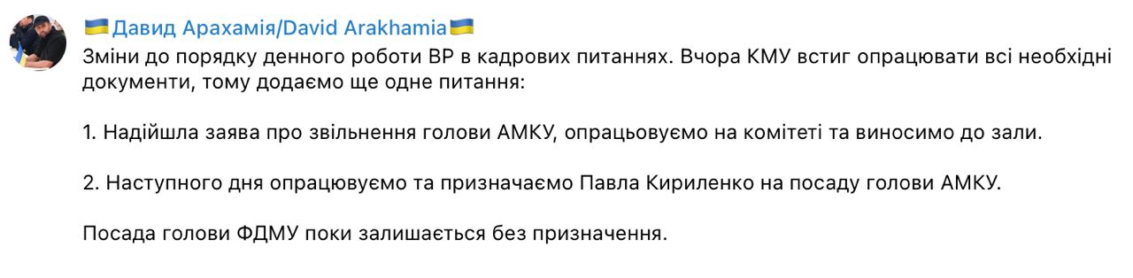09:41 Давид Арахамия подтвердил информацию, что новым главой АМКУ хотят назначить донецкого губернатора Павла Кириленко.