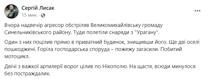 Вчера вечером Россия обстреляла Великомихайловскую громаду Синельниковского района из "Урагана". Повреждены частные дома.