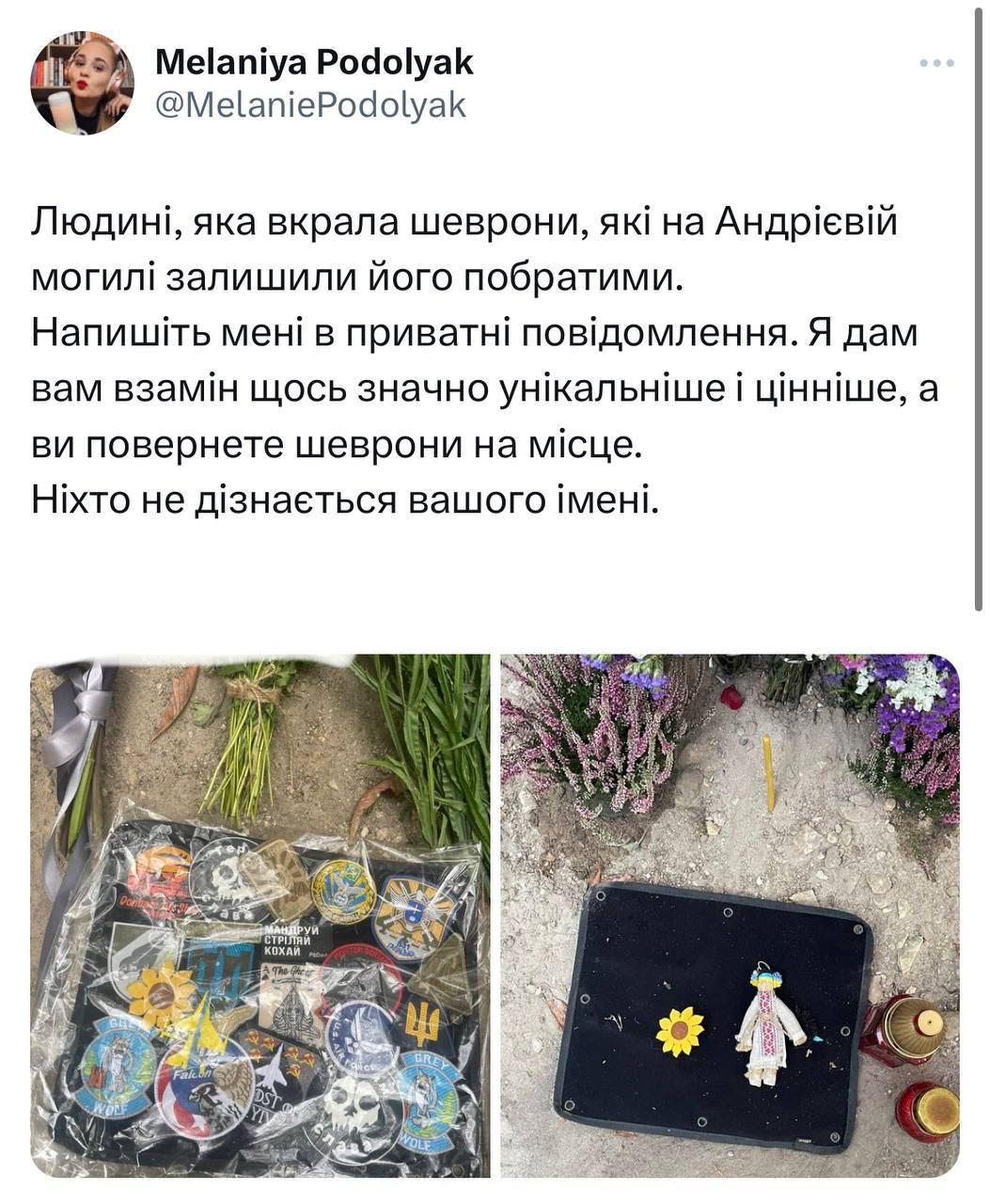 "Человеку, укравшему шевроны, которые на могиле Андрея оставили его побратимы. Напишите мне в личные сообщения", - написала Подоляк.
