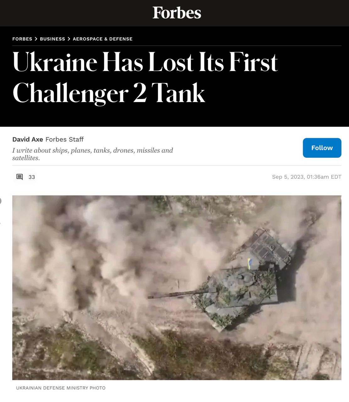 Журнал опубликовал заметку под названием "Украина потеряла свой первый танк "Челленджер-2", ссылаясь на то же видео, появившееся в сети, что и россияне.