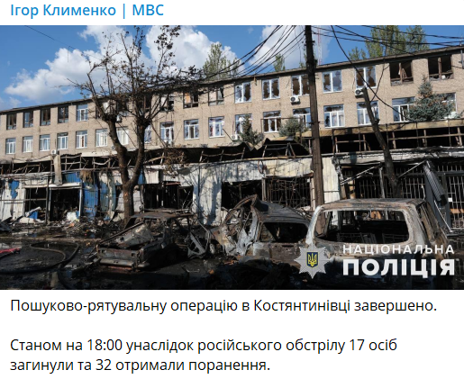 В Константиновке Донецкой области завершили поисковую операцию после прилёта по рынку. По состоянию на 18:00 погибли 17 человек, еще 32 - получили ранения.