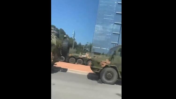На кадрах по улицам города перемещается большое количество колёсной бронированной техники (БТР, БМП), бортовых грузовых автомобилей военного назначения.
