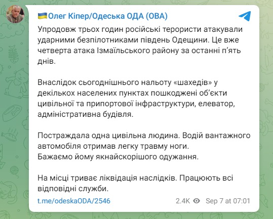 Дронами были атакованы объекты припортовой и гражданской инфраструктуры Измаильского района. Пострадали два водителя грузовиков, разрушен элеватор и административные помещения. Взрывной волной повреждены частные дома.