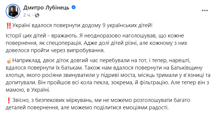 "Истории этих детей – впечатляют. Я неоднократно отмечал, что каждое возвращение как спецоперация. Ведь судьбы детей разные, но каждому из них пришлось пройти через испытания", - написал омбудсмен.