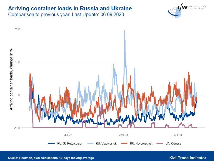 "Это происходит, несмотря на санкции, введенные западными странами, и падение курса рубля, что разочаровывает. Похоже, Россия возвращается в мировую торговлю", - заявил в докладе Винсент Стамер, глава института Kiel Trade Indicator.