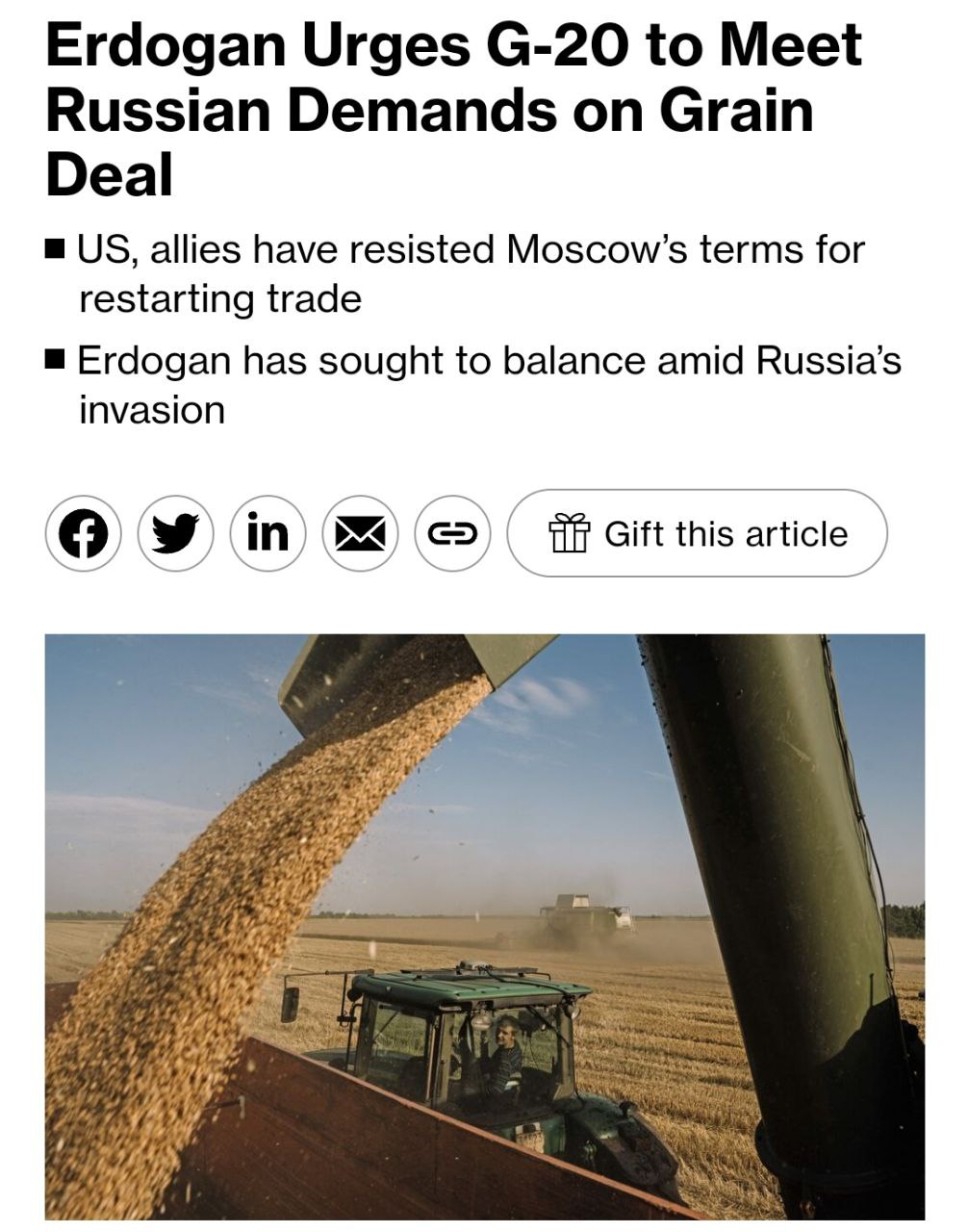 Президент Турции призвал G20 выполнить требования России и возобновить зерновую сделку