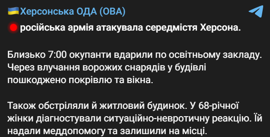 Сегодня утром российские войска ударили по центру Херсона. В результате обстрела получили повреждения образовательное заведение и жилой дом. Пострадала женщина.