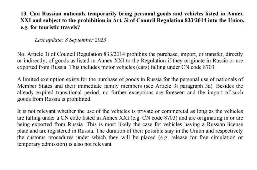 "Не имеет значения, используется ли транспортное средство в частных или коммерческих целях, если транспортное средство… происходит из россии или экспортируется из нее. Чаще всего это касается транспортных средств, имеющих российские номерные знаки и зарегистрированных в России", - сказано в опубликованном документе.