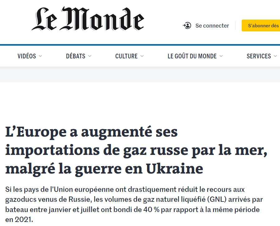 Как отметили в финском Центре исследований энергетики и чистого воздуха, продажи СПГ в Европу принесли российской экономике более 5 миллиардов евро с января по июль - более чем в два раза больше, чем за аналогичный период 2021 года.