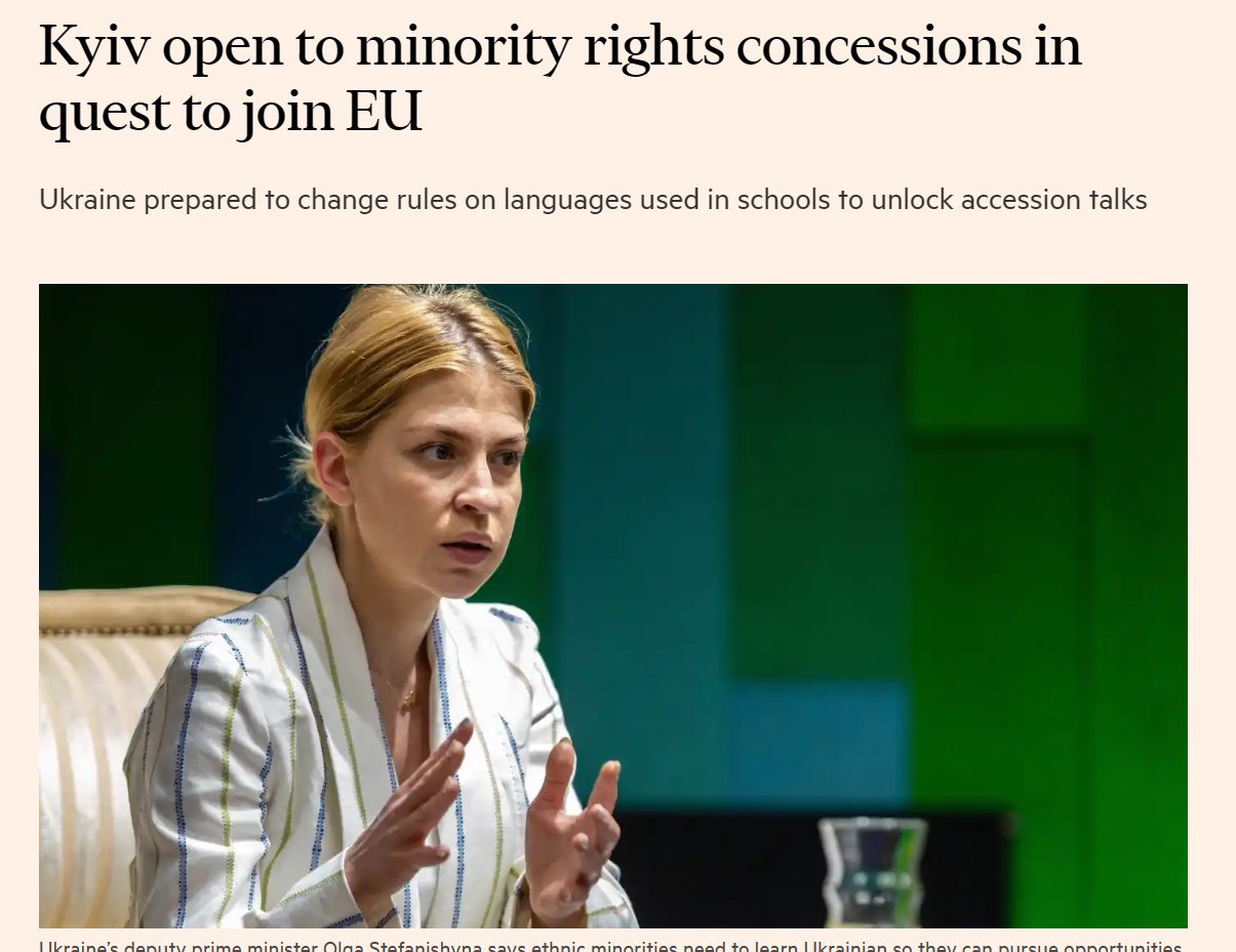 При этом FT напоминает, что Венецианская комиссия при Совете Европы также считает, что Украина должна защищать языковые права русскоязычных. Но "Стефанишина ранее выражала уверенность, что ЕС не будет откладывать начало переговоров по этому вопросу".
