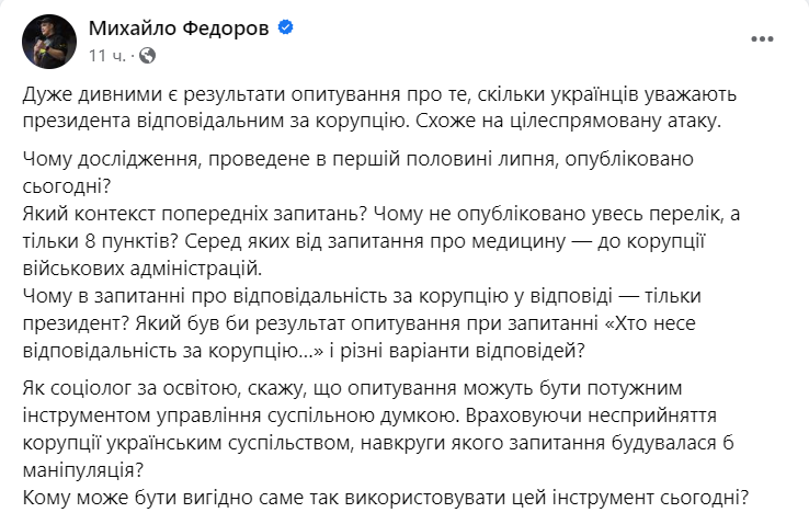"Очень странными являются результаты опроса про то, сколько украинцев считают президента ответственным за коррупцию. Похоже на целенаправленную атаку", – заявил Федоров.